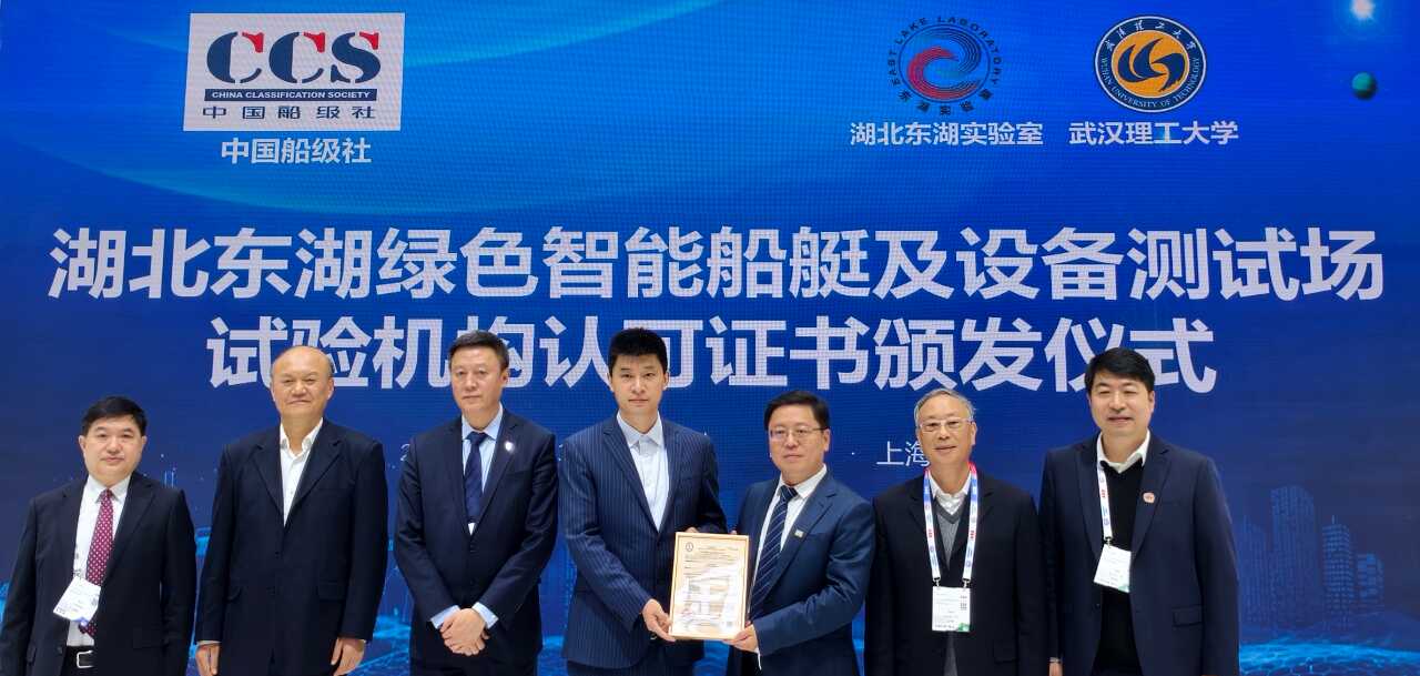近日,中国国际海事展现场传来重磅喜讯:湖北东湖实验室联合武汉理工大学成功获得中国船级社颁发的国内首张智能船艇及设备测试试验机构认可证书。这一里程碑式的事件,标志着我国智能船艇及设备测试领域逐步迈入标准化、规范化发展新阶段,更彰显了湖北东湖实验室和武汉理工大学在该领域的引领性科研实力。在湖北东湖实验室首席科学家、中国工程院院士严新平,中国船级社总裁赵晏,武汉理工大学副校长张笛,湖北东湖实验室常务副主任吴志振等嘉宾的共同见证下,中国船级社武汉分社副总经理何伟向湖北东湖实验室智能船用装备技术创新中心主任刘佳仑颁发了试验机构认可证书。