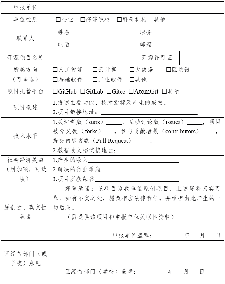 申请表(附件),营业执照(或学院证明),开源项目详细资料(包括但不限于项目名称、电子链接、所属方向、主要功能、使用教程、技术指标及产生的成效),开源项目影响力佐证材料(包括但不限于关注者数、互动讨论数、项目被分叉数、参与贡献者数、提交内容者数等活跃度相关内容)。