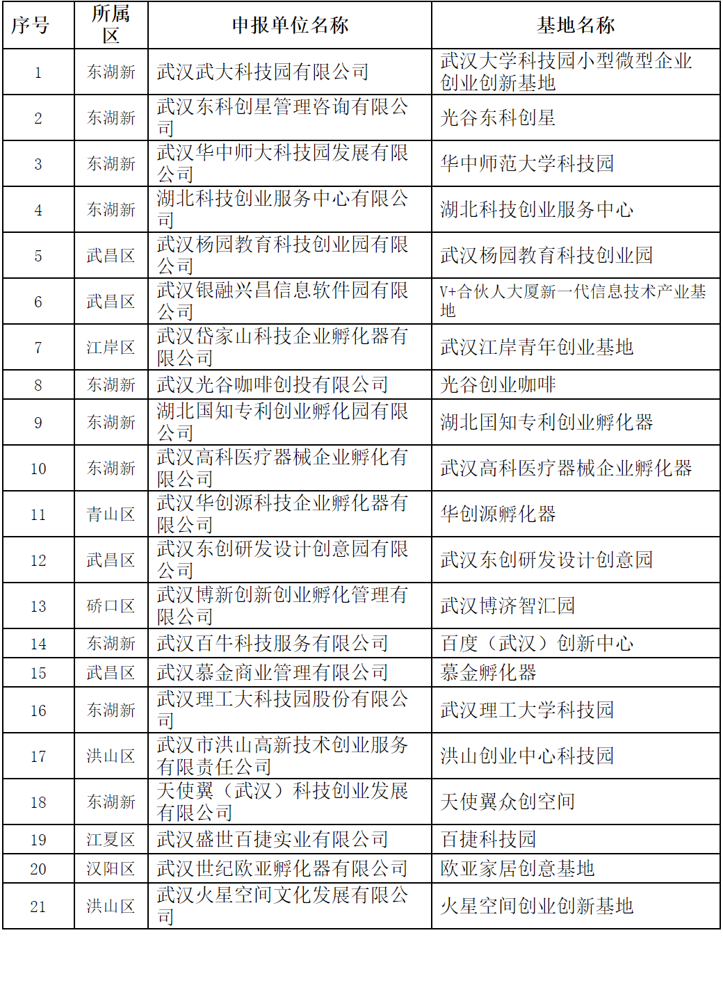 按照《市经济和信息化局关于印发武汉市小型微型企业创业创新示范基地管理办法的通知》(武经信规[2020]1号)(以下简称管理办法)及《市经信委关于印发<武汉市小型微型企业创业创新示范基地专项资金管理办法>的通知》(武经信创业[2018]69号)的有关规定,现将2020年武汉市小型微型企业创业创新示范基地认定及奖励资金分配方案予以公示,接受社会监督。公示期为2020年10月19日至10月23日。如对公示的基地和申报单位有异议,请于2020年10月23日前向市经信局机关纪委或中小企业发展处反映。