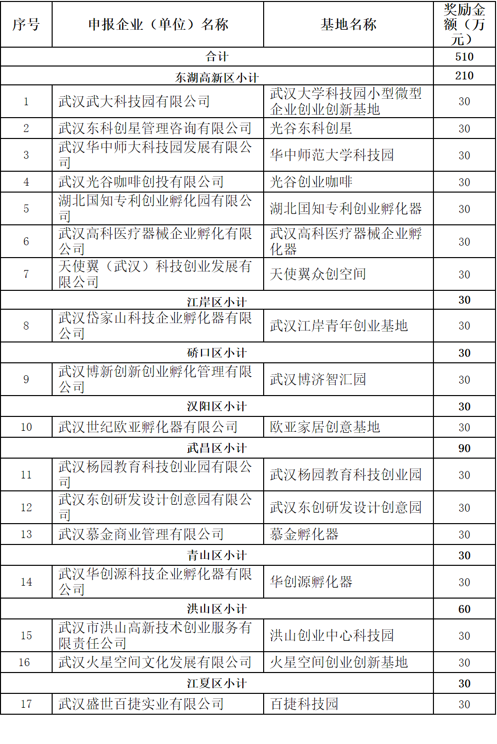 2020年武汉市小型微型企业创业创新示范基地奖励资金分配方案